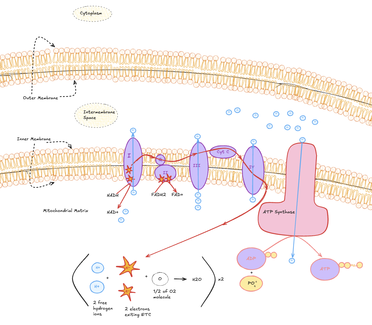 Electrons from NADH and FADH₂ move through membrane-bound protein complexes, driving proton pumping and creating an electrochemical gradient. Protons flow back through ATP synthase, producing ATP. Oxygen accepts the electrons at the end, forming water.