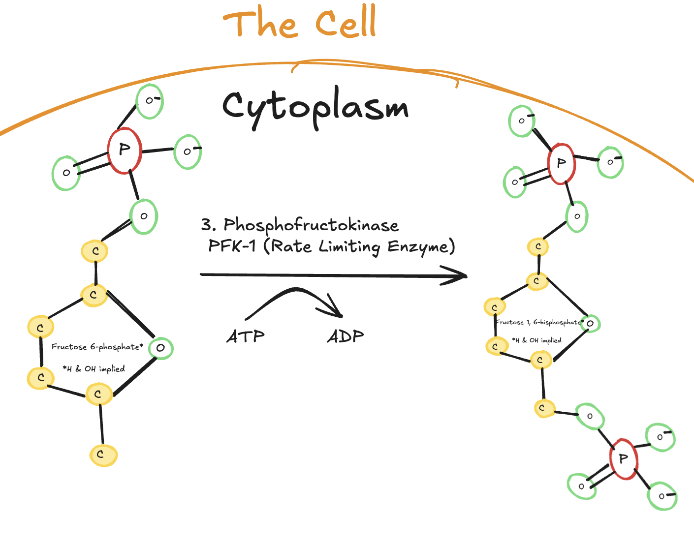 Digitally drawn diagram of the third step of glycolysis in the cytoplasm, showing fructose-6-phosphate phosphorylated by phosphofructokinase-1 (PFK-1) using ATP to form fructose-1,6-bisphosphate.