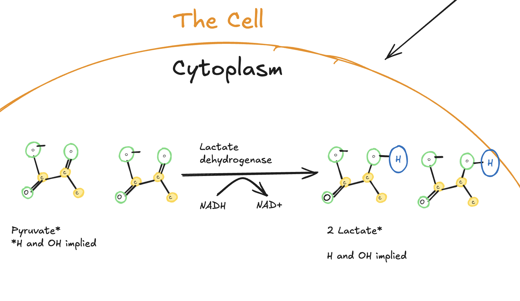 Digitally drawn diagram showing pyruvate reduced to lactate in the cytoplasm by lactate dehydrogenase, with NADH oxidized to NAD⁺ to regenerate electron carriers, producing two lactate molecules per glucose.