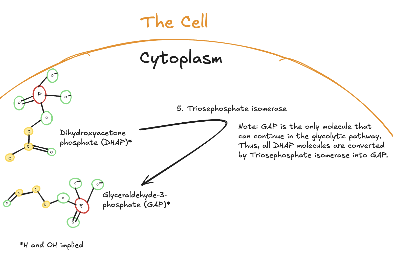 Digitally drawn diagram of the fifth step of glycolysis in the cytoplasm, showing dihydroxyacetone phosphate (DHAP) converted into glyceraldehyde-3-phosphate (GAP) by triosephosphate isomerase.