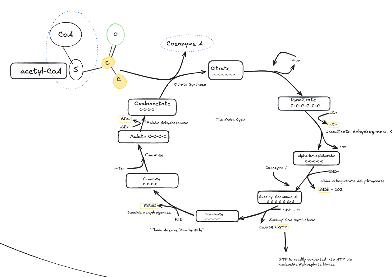 Hand-drawn schematic of the Krebs cycle in the mitochondrial matrix, showing acetyl-CoA entering the cycle, carbon dioxide release, and production of NADH, FADH₂, and GTP.
