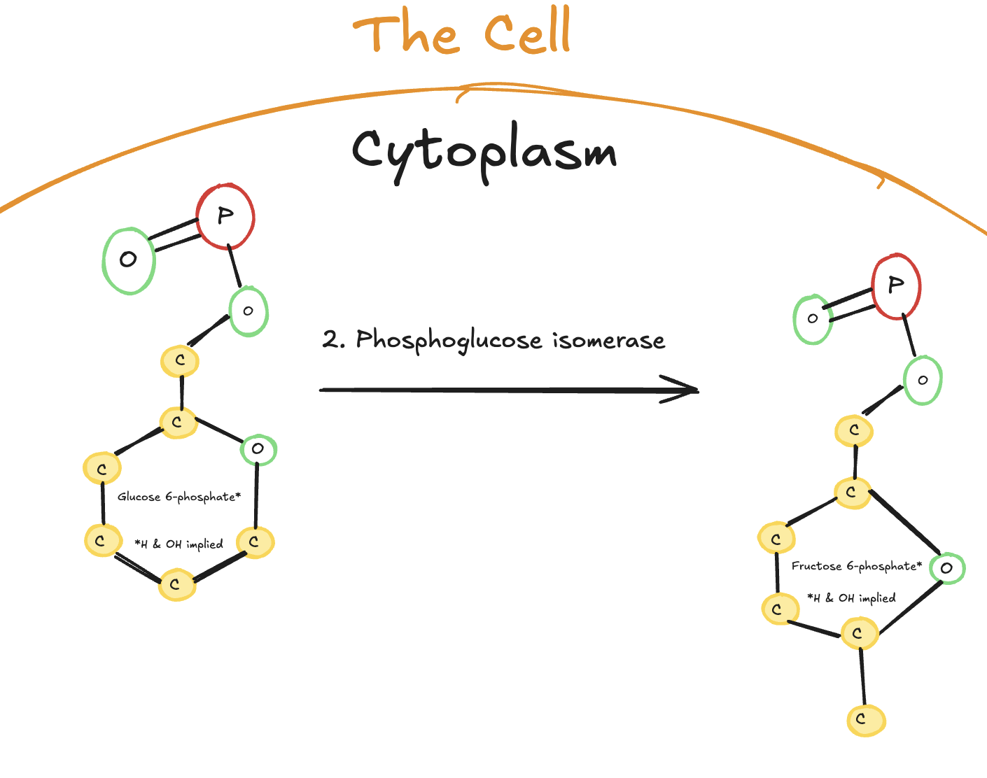 Digitally drawn diagram of the second step of glycolysis in the cytoplasm, showing glucose-6-phosphate converted into fructose-6-phosphate by phosphoglucose isomerase.