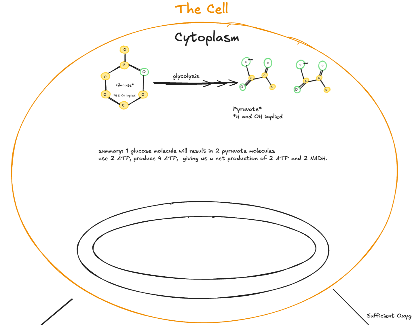 To prepare, I used Excalidraw to sketch the pathways involved in glycolysis, the Krebs cycle, and the electron transport chain. The drawings were not intended to be polished instructional graphics. They were thinking tools. Sketching the pathways by hand forced me to confront gaps in my understanding and clarify how energy and electrons move through the system.