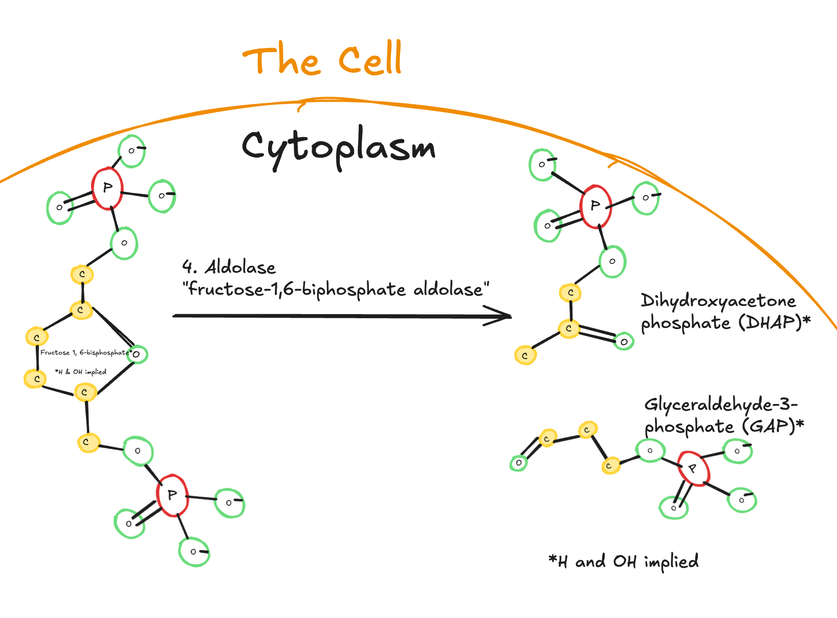 Digitally drawn diagram of the fourth step of glycolysis in the cytoplasm, showing fructose-1,6-bisphosphate cleaved by aldolase into dihydroxyacetone phosphate (DHAP) and glyceraldehyde-3-phosphate (GAP).