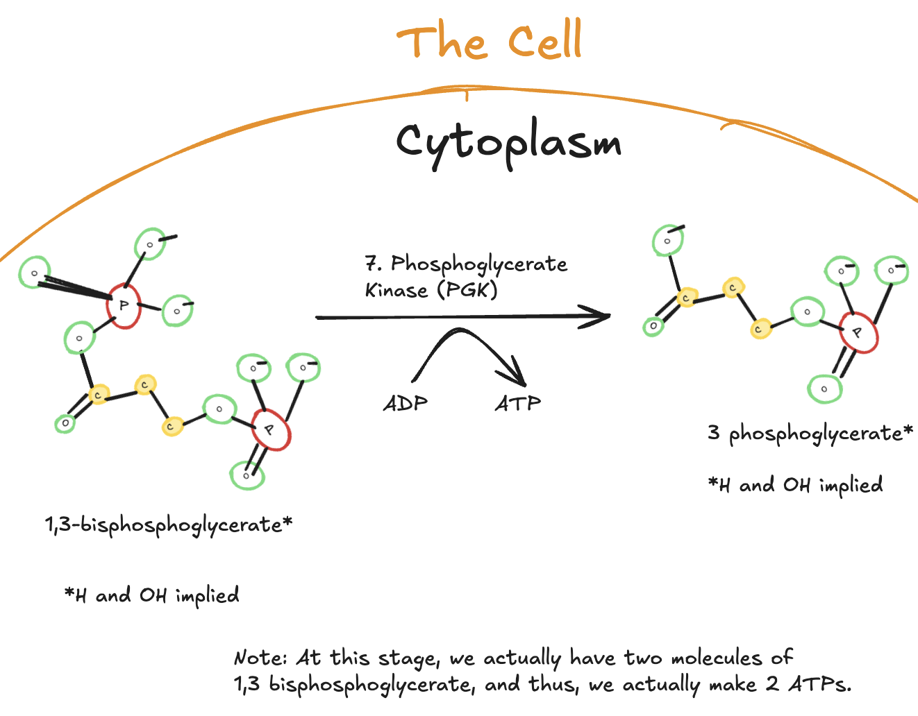 Digitally drawn diagram of the seventh step of glycolysis in the cytoplasm, showing 1,3-bisphosphoglycerate converted to 3-phosphoglycerate by phosphoglycerate kinase, with ATP generated from ADP.