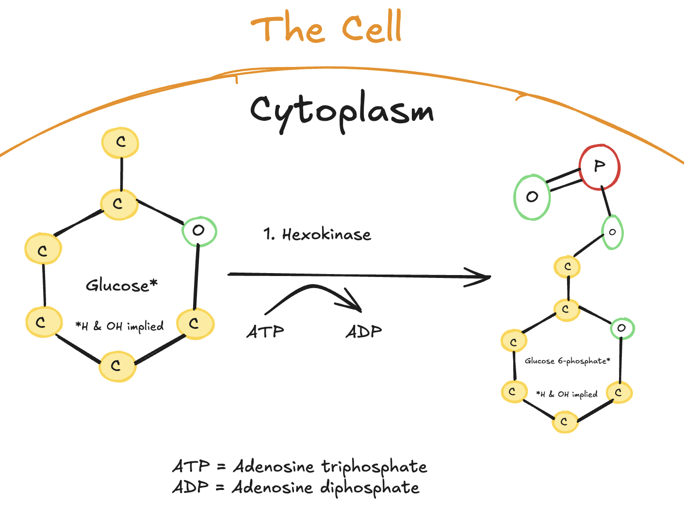 Digitally drawn diagram of the first step of glycolysis in the cytoplasm, depicting a six-carbon glucose molecule converted to glucose-6-phosphate by hexokinase, with ATP donating a phosphate group and becoming ADP.