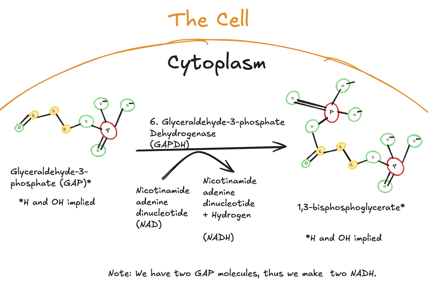 Digitally drawn diagram of the sixth step of glycolysis in the cytoplasm, showing glyceraldehyde-3-phosphate oxidized to 1,3-bisphosphoglycerate by glyceraldehyde-3-phosphate dehydrogenase, with NAD⁺ reduced to NADH.