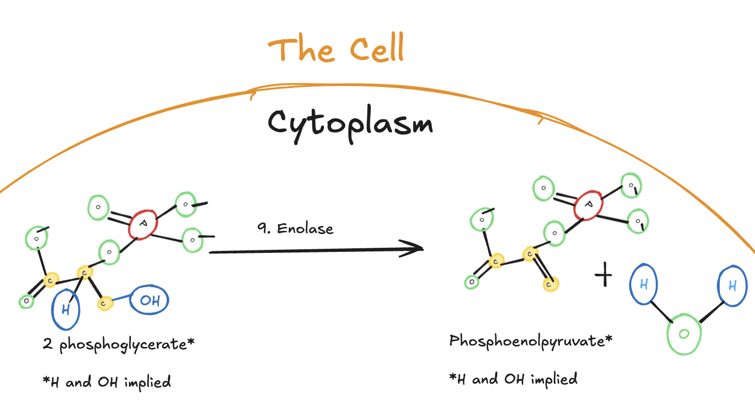 Digitally drawn diagram of the ninth step of glycolysis in the cytoplasm, showing 2-phosphoglycerate converted to phosphoenolpyruvate (PEP) by enolase with the release of water.
